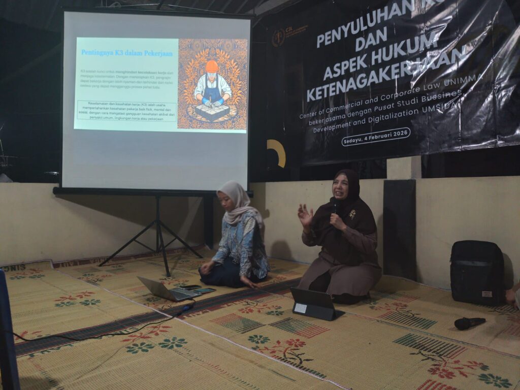 Magelang, 4/2/2026 – Pelaku industri seni kerajinan pahat batu di Magelang mengikuti kegiatan edukasi mengenai hukum ketenagakerjaan, legalitas usaha, serta keselamatan dan kesehatan kerja (K3). Kegiatan ini diselenggarakan oleh Pusat Studi Business, Development, and Digitalization Universitas Muhammadiyah Sidoarjo (UMSIDA) bekerja sama dengan Pusat Studi Commercial and Corporate Law Universitas Muhammadiyah Magelang (UNIMMA).